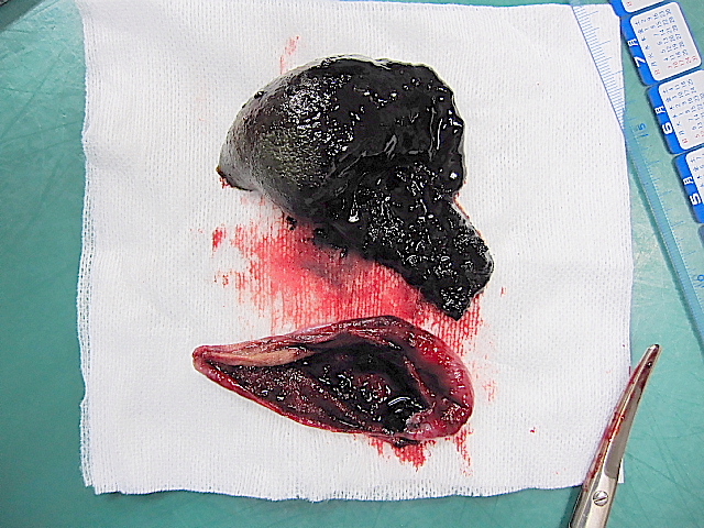 上の黒いのが胆泥がゼリー状に固まったもので、胆嚢粘膜と同化していました。